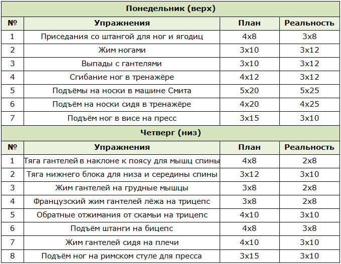 Для демонстрації того, наскільки різними можуть бути щоденникові записи спортсменів, ось приклад журналу тренувань у тренажерному залі: