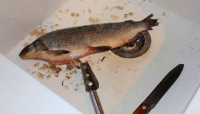 Спочатку тушку добре очищують від нутрощів. Шкуру ретельно очистити від луски і промивають під проточною водою.
