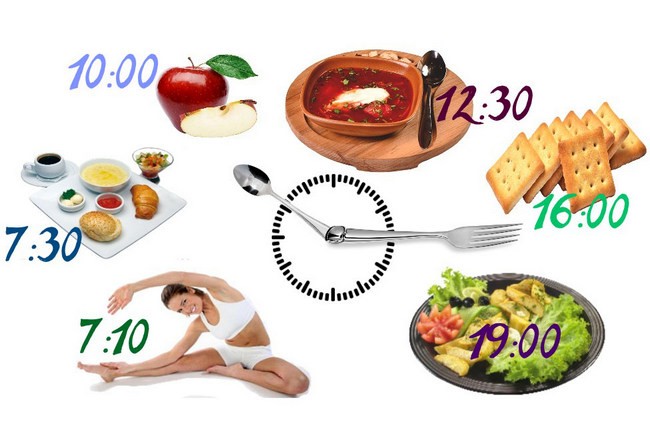 - Примірний режим: сніданок — 7-8 годин, обід — о 13-14, вечеря в 18-19.