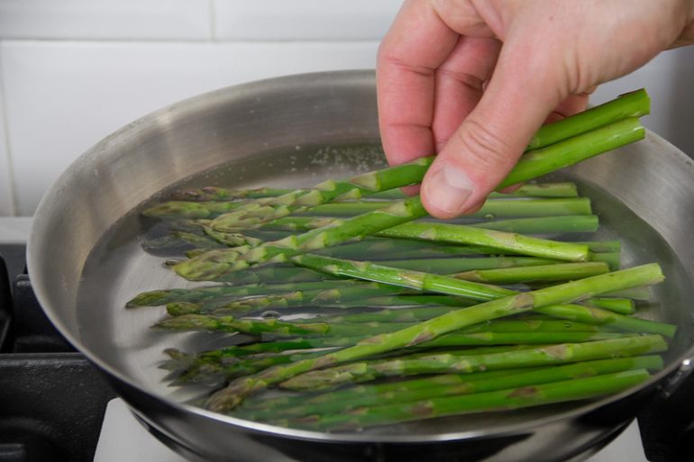 Після цього ще 4 хвилини спаржу тушкують на слабкому вогні, потім знімають кришку і додають температуру. Після того як при постійному помішуванні з дна сковороди випарується вся волога і сік спаржі, страву можна знімати з плити і подавати до столу.