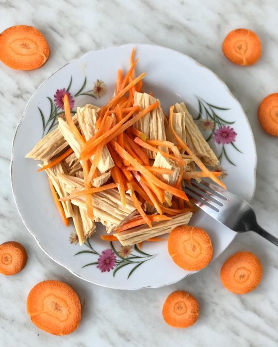 - Сушений продукт потрібно замочити в прохолодній воді мінімум на 4 години. Якщо немає можливості залишити його на такий довгий час, то можна просто залити фучжу окропом і залишити на пару хвилин для розбухання. Але при такому способі готування смак буде набагато менш приємним, і багато аромати і корисні властивості соєвого спаржі не розкриються повною мірою.