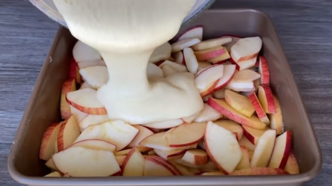 - Просіяне борошно всипаємо в масу, вимішуємо міксером тісто. Заливаємо яблука.