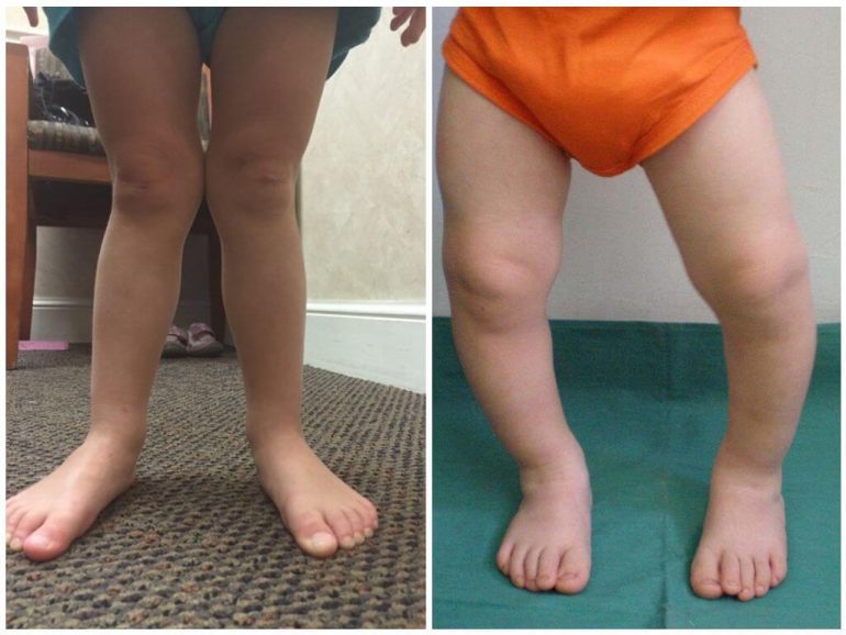 | Ознаки | Після формування стійких змін ноги набувають дугоподібної форми (нагадують букву «П»). Дитяче взуття зношується нерівномірно: зовнішній край підошви стирається швидше. При зведенні колін малюк скаржиться на біль і плаче. Ходіння нагадує клишоногість — стопи відвертаються назовні, у процес можуть залучатися тазостегнові суглоби | Ноги змінюють контур і набувають вигляду, схожого на букву «Х». Патологія зачіпає колінні та тазостегнові суглоби. Під час огляду помітне надмірне розгинання в коліні. Взуття інтенсивно стоптується з внутрішнього боку. Згодом часто приєднується плоскостопість: ступні викривляються всередину, п’яти йдуть назовні. За відсутності лікування можуть з’явитися ознаки сколіозу |