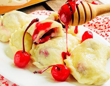 Пишні вареники на пару з вишнею подавайте зі сметаною. Додатково можна присипати їх пудрою.