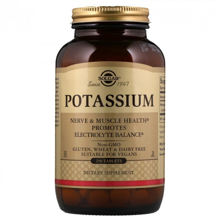 - Калій (Solgar). У кожній упаковці міститься 20 таблеток (дозування – 1 штука на день). Добавка підтримує електролітний баланс і здоров’я м’язів, нервової системи. Засіб не містить шкідливих компонентів і відрізняється високою ефективністю.