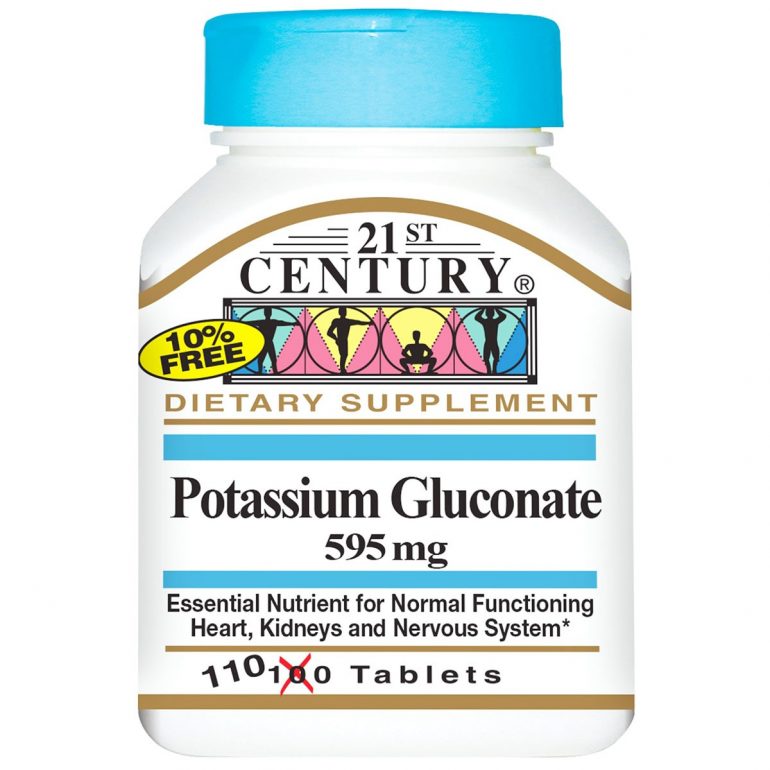 - Глюконат калію (21st Century). Упаковка включає 110 таблеток. Дозування передбачає прийом 1 таблетки на добу (під час їжі). Препарат призначають дорослим і дітям старше 14 років. До недоліків комплексу відносять низьку концентрацію активної речовини та ефективність.