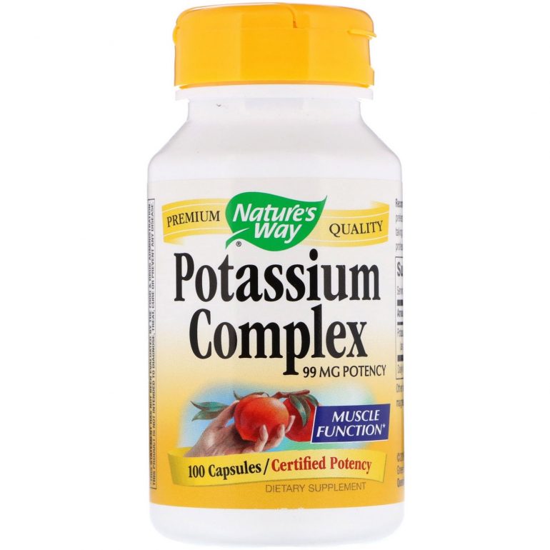 - Комплекс калію (nature’s way). Упаковка містить 100 капсул. Активна речовина – цитрат калію. Дозування становить прийом 1 капсули на добу. Біологічно активна добавка не містить ароматизаторів і цукру. Препарат усуває м’язові болі та судоми. На тлі використання можуть виникати болі в області шлунка.