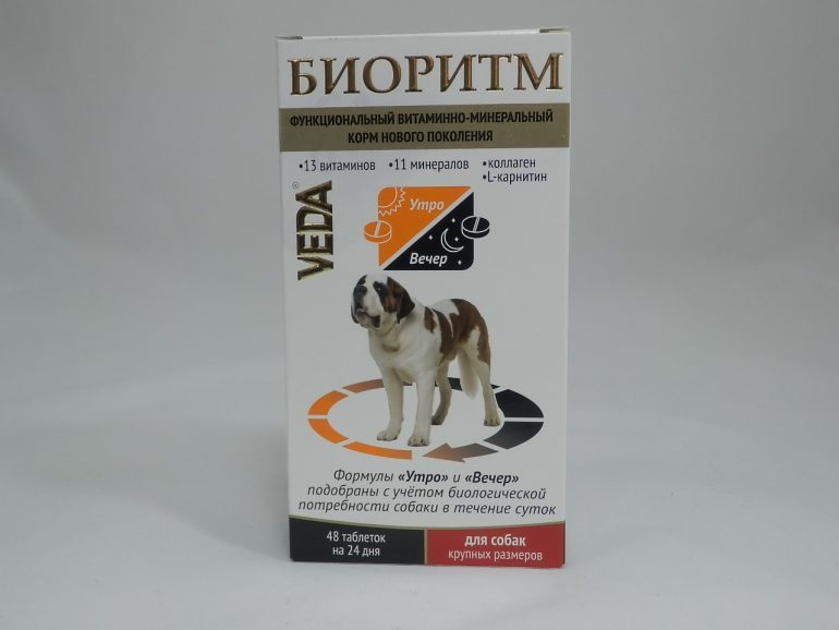 - «Veda Біоритм». Препарат випускається у таблетованій формі і включає ранкові та вечірні пігулки. У першому випадку вони покращують функцію шлунка, сприяють швидкому заповненню енергії і зміцненню ЦНС. У другому – покращують засвоєння їжі, і насичують кров киснем. Також до складу препарат входить гідролізат колагену, який у поєднанні з кальцієм зміцнює суглоби і хрящову тканину. Ці вітаміни для росту цуценят великих порід можна використовувати у віці 10-12 місяців. Повний курс 24 дні.