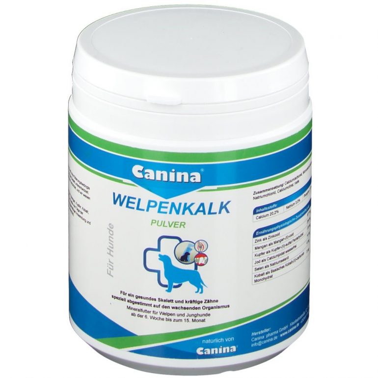 - «Canina WELPENKALK Pulver». Ці вітаміни для цуценят дрібних порід з кальцієм і фосфором можна давати з 6-тижневого віку. Вони сприяють зміцненню кісткової тканини і нервової системи.