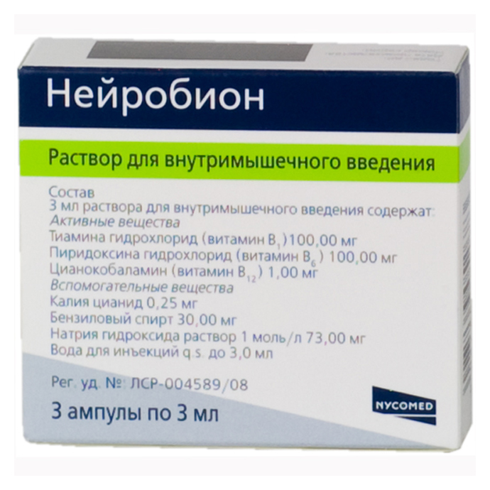 - Нейробион. Комплекс, що складається з вітамінів групи В. Покращує метаболічні процеси. Випускається у вигляді розчину, який вводять в організм через відень.