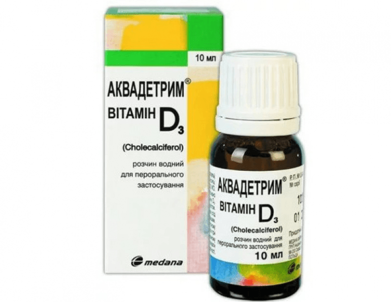 - Аквадетрим. Вітаміни легко засвоюються. Проводиться Аквадетрим на водній основі. В 1 краплі — 500 МО діючого компонента.