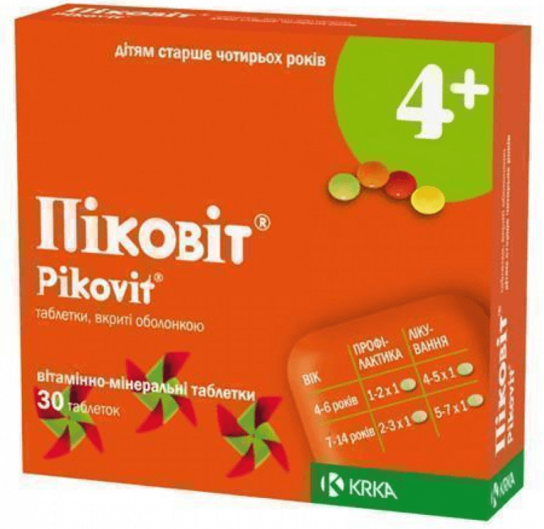 - Піковіт Форте — засіб для нормального перебігу метаболічних процесів. З 7 років приймають по 1 таблетці на добу з метою лікування. Тривалість вживання — по рекомендації лікаря.