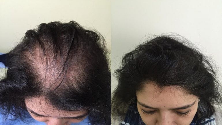 Стан волосяного покриву до (зліва) і після (праворуч) прийому вітамінів для волосся Алерана