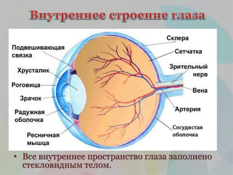 Ретина складається з десяти шарів клітин і лежить на судинній оболонці (хориоіді), що відповідає за постачання поживних речовин. Склоподібне тіло (витреум) займає порожнину заднього ділянки очного яблука, складається з води, невеликої кількості білка і гіалуронової кислоти. Витреум відповідає за збереження форми і тонусу очного яблука та проведення світлових променів на сітківці.