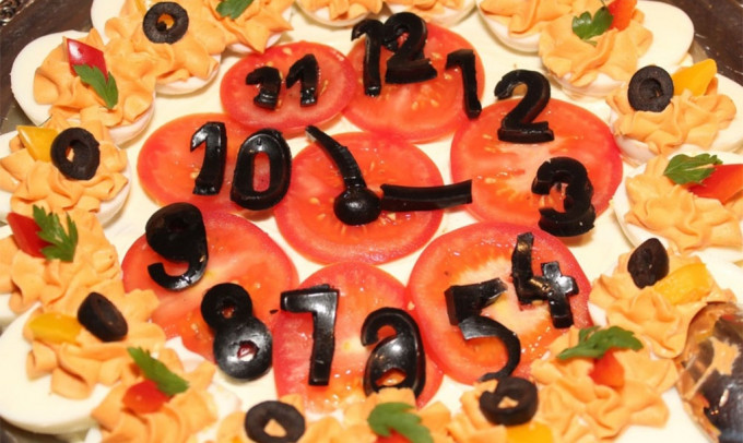 - З маслин вирізати цифри, стрілки, викласти їх у циферблат. З решти нарізати кухлі, декорувати ними яйця.